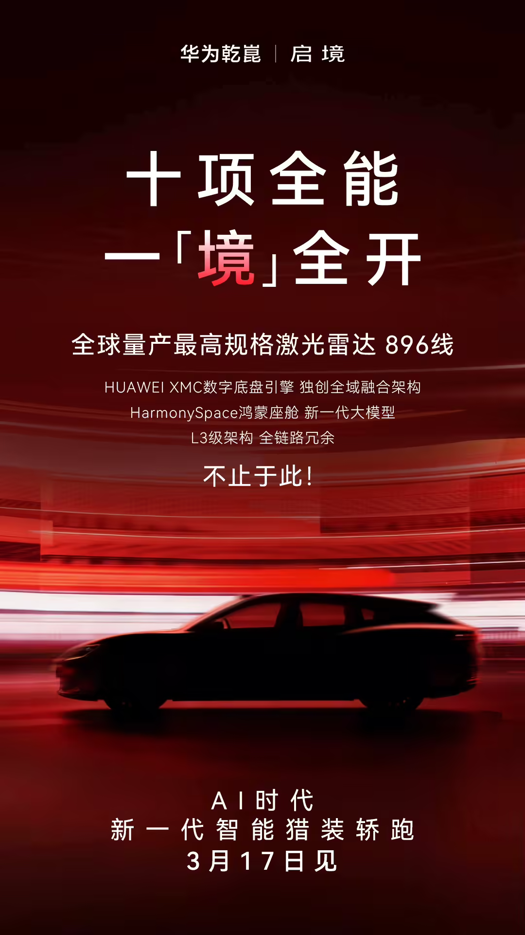 华为乾崑与广汽合作新车:启境新一代智能猎装轿跑 3 月 17 日见,全球量产最高 896 线激光雷达