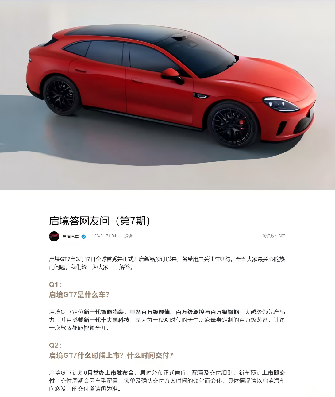 4月1日消息,启境汽车官方微博重新发布了答网友问(第7期),针对华为乾崑|启境GT7新一代智能猎装车上市交付时间安排进行了调整。启境汽车官方表示,启境GT7计划6月举办上市发布会,届时公布正式售价、配