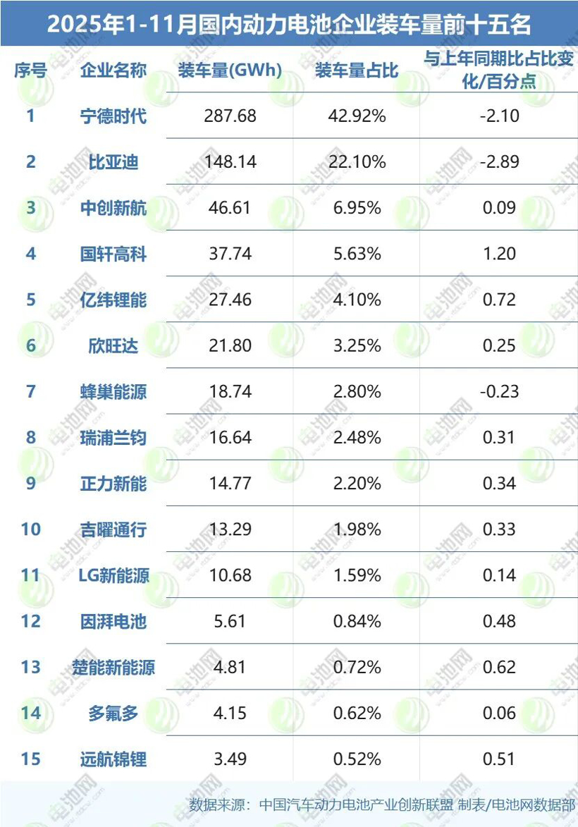 2025年1-11月,上述六家中国电池公司的总装车量为726.9GWh,市场份额从去年同期的66.2%进一步提升至69.4%。