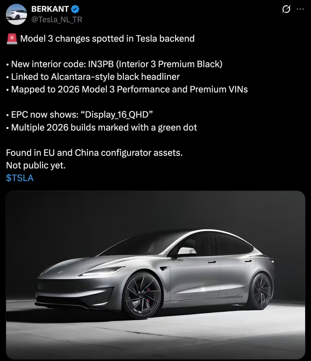 IT之家 2 月 25 日消息,数据挖掘者 BERKANT 在分析特斯拉中国 / 欧洲官网汽车配置器时发现,特斯拉有望为新款 Model 3 Premium 版(海外 Premium 版对应国内标续后驱 / 长续后驱 / 长续全驱)及 Performance 版(Model 3P)引入 2026 款 Model Y 同款 16 英寸 2K 中控屏,同时还将为汽车新增黑色车顶内衬可选。