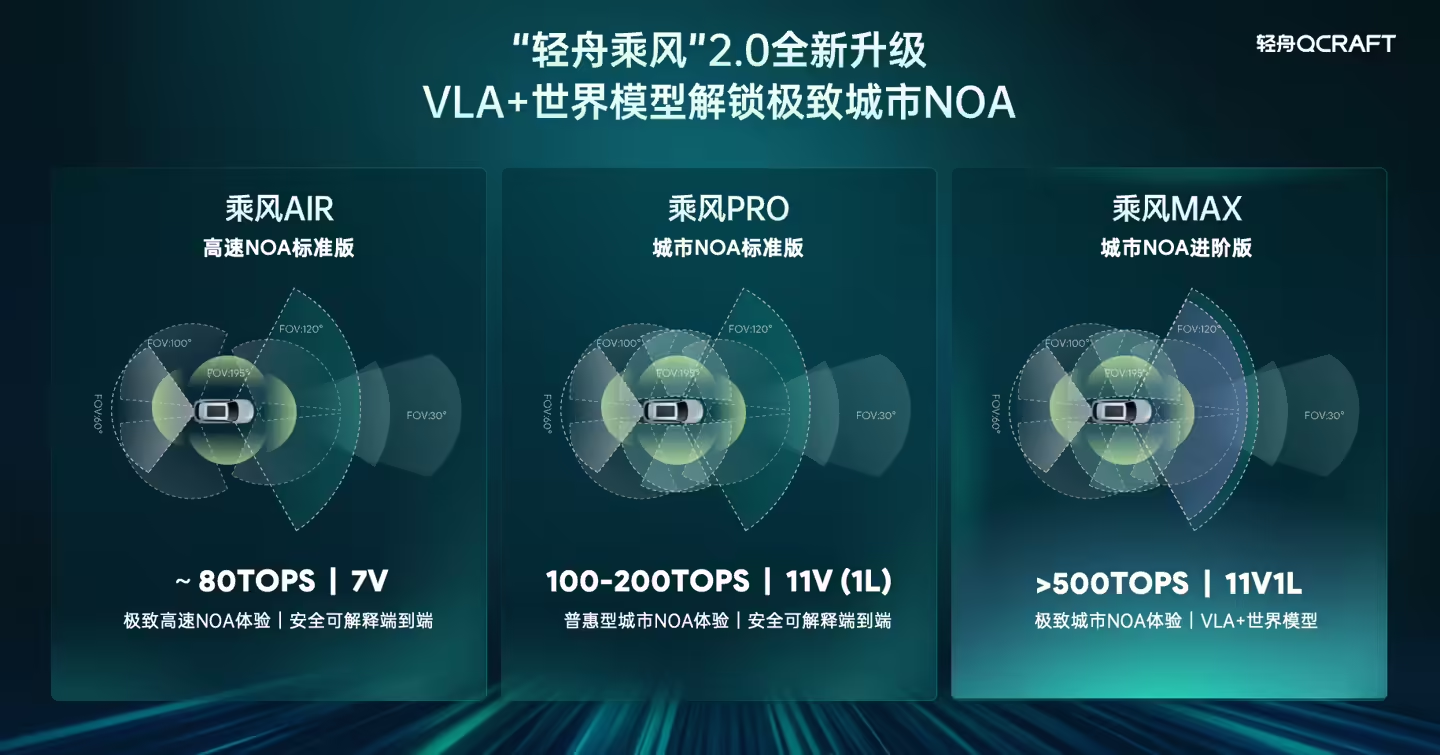 乘风 PRO 方案采用约 100 至 200TOPS 算力、11V 或 11V1L 配置,提供城市 NOA 功能;