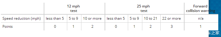 与Euro NCAP一样,IIHS在测试过程中都对自动制动和碰撞预警进行评价。不过IIHS只在两个速度下(12mph和25mph,即约20km/h和40km/h)对AEB系统进行评价。在IIHS的评价中,AEB系统评价的总分为6分。车辆配备有效的碰撞预警系统,可以得到1分;在车速为12mph时,车辆能够避免碰撞,可以得到满分2分;在车速为25mph时,车辆能够避免碰撞,可以得到满分3分。