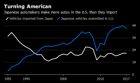 当谈到汽车时,日本车企在美国组装的汽车数量已超过从日本进口的两倍。日本汽车制造商协会的数据显示,2017年,日本汽车制造商在美国工厂组装380万辆汽车;与此同时,美国从日本进口的轿车和卡车数量同比下降45%,从310万辆降至170万辆。